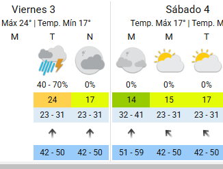 El área será afectada por lluvias y tormentas de variada intensidad, algunas localmente fuertes. Las mismas estarán acompañadas principalmente por abundantes precipitaciones. Además se prevé actividad eléctrica, ocasional granizo y ráfagas que pueden alcanzar los 80 km/h. Se estiman valores de precipitación acumulada entre 30 y 60 mm, que pueden ser superados de manera puntual.